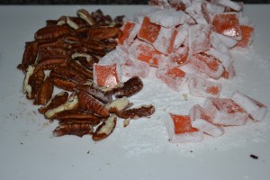 • 1 small or medium box Turkish delight (Sold in Middle Eastern or international food stores. My favorite flavor is the classic rose.) Cut each piece into 4-5 smaller rectangular pieces.