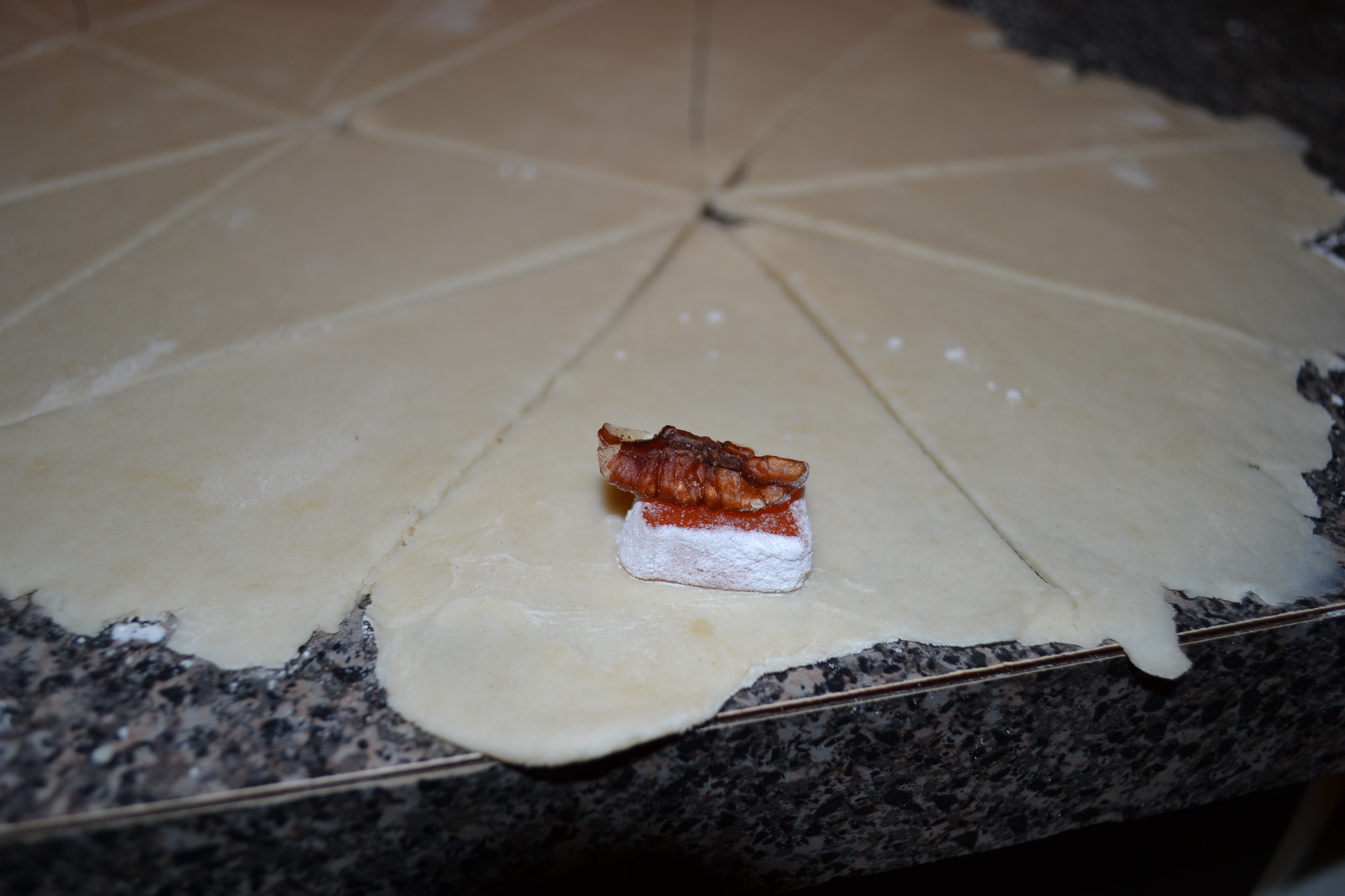 Place a cup of flour on the bottom of a mixing bowl. Create a “well” in the flour and add lard. Add ½ cup powdered sugar, wine and vanilla. Mix well (with your hands) adding flour as needed, until dough is semi-hard. It should be slightly crumbly. Divide into two balls. Roll each ball into a circle to about less than a ¼ inch thick. Cut triangles (base about 3 inches wide). Place a small piece of Turkish delight and a pecan quarter towards the bottom of each triangle. Roll into crescents. Makes about 60 cookies.